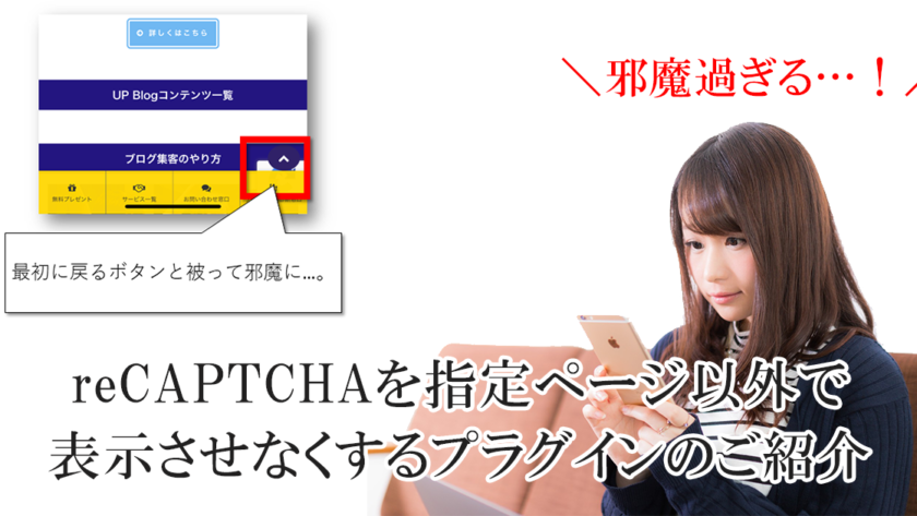 しかし、下のスクリーンショットの様に『reCAPTCHA』のタグ上のものがずーっとページ内で表示されてしまう為、操作に邪魔になってしまう事が悩みのタネになってしまいました。