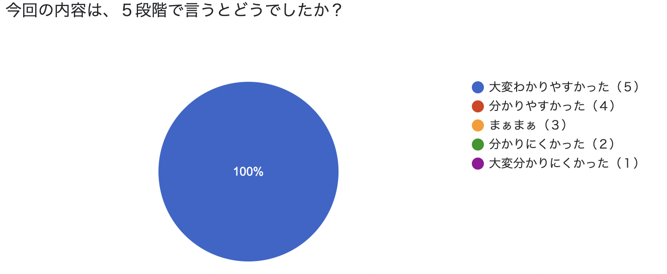 ご覧いただいての通り、分かりやすさと満足度は満場一致の5(最高評価)でした!