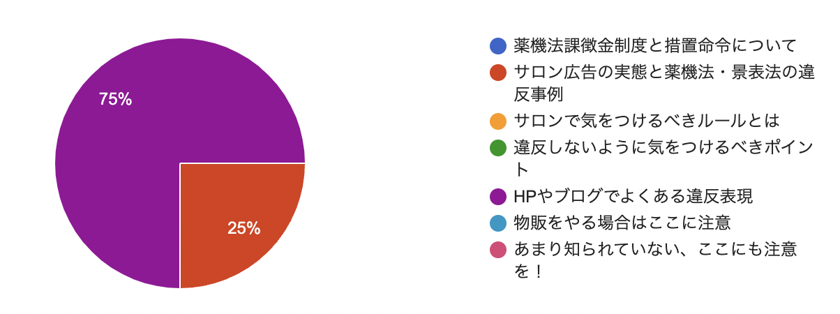 次に、「全体の中で特によかったパートはどこですか?」という問いに対しては、75%が『HPやブログでよくある違反事例』でした。