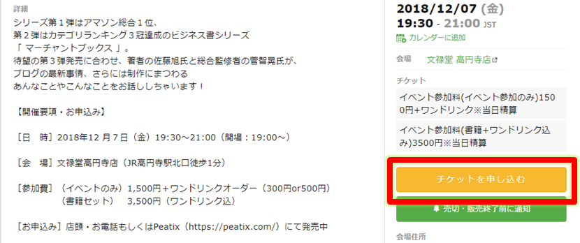①お申し込みページ右側にある『チケットを申し込む』ボタンをクリックしてください。