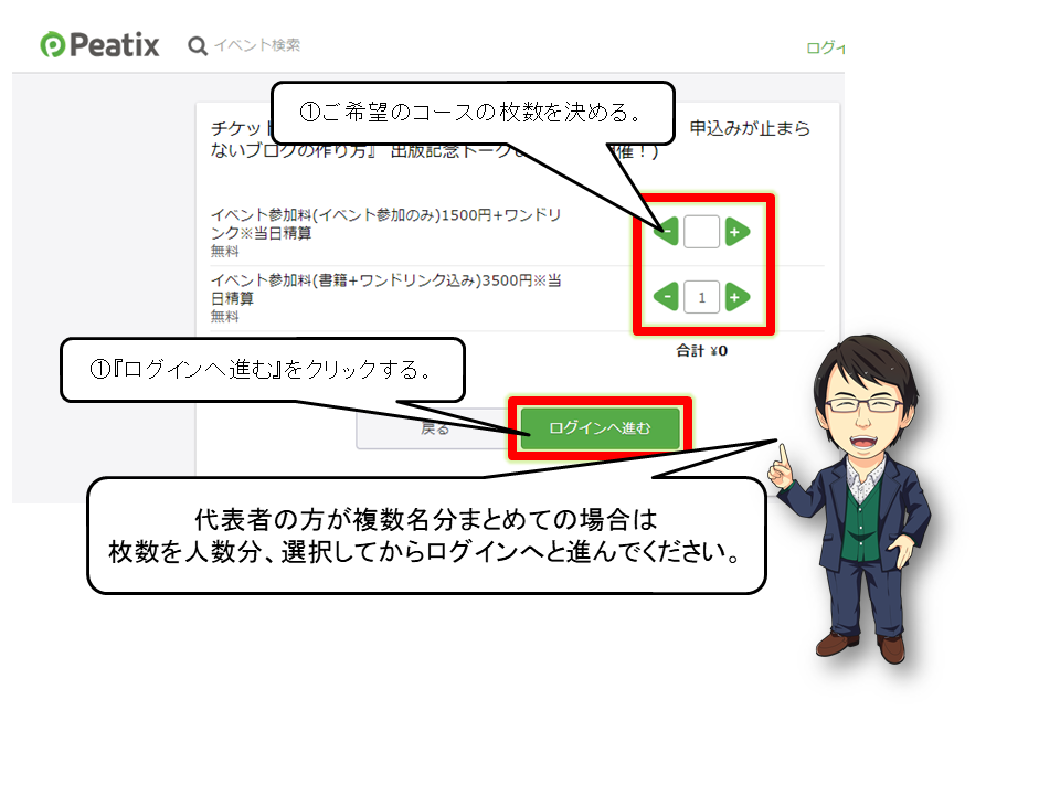 ②当日書籍を受け取れるセット、もしくはイベントのみいずれかの右側にある数字を参加者人数に設定し、『ログインへ進む』ボタンをクリックしてください。